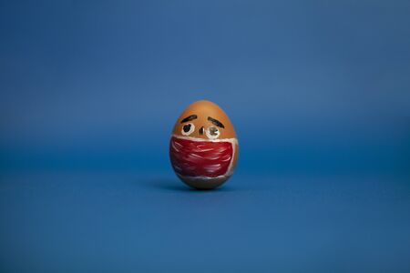The egg face in a medical mask and scared on a blue background. Covid-19 pandemic. top view