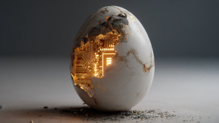 A stunning visual representation of a cracked egg showcasing a circuit board within, combining elements of nature and technology in a captivating design.