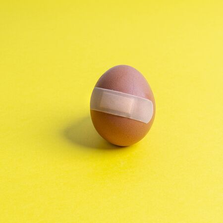 Broken egg with sticking plaster. Concept of brittleness and pain.