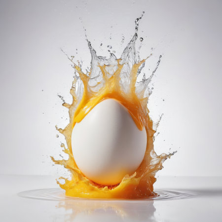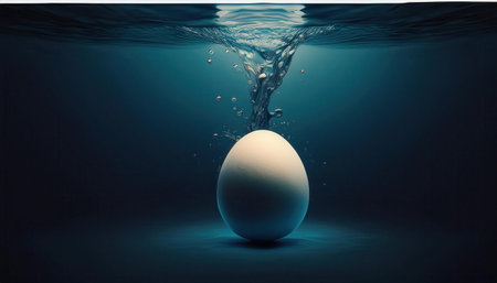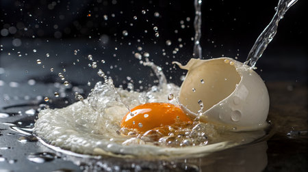 A dramatic shot of a cracked egg splashing into water, capturing the dynamic moment of impact. Ideal for culinary, food photography, and dynamic action themes.
