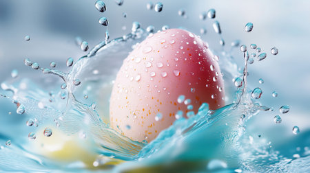 A beautifully captured pink egg surrounded by droplets of water, creating a dynamic splash effect. This image evokes feelings of freshness and vitality, perfect for spring themes or culinary projects