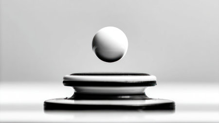 A white sphere hovers above a dark, tiered platform, set against a bright white background. The composition is simple, with strong contrast and clean lines. This image showcases a precise arrangement with potential uses in various commercial and editorial projects, highlighting balance and symmetry.