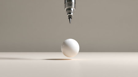 A close-up captures a pencil poised above a pristine white egg, hovering in mid-air. The scene is bathed in soft, diffused lighting, highlighting the smooth textures and subtle shadows. The composition suggests a studio setting with a clean, neutral background. This image is suitable for various commercial uses, including advertising and editorial content.
