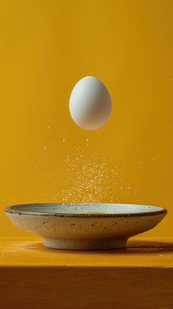 Floating White Egg Above Ceramic Plate on Vibrant Orange Background with Splashes