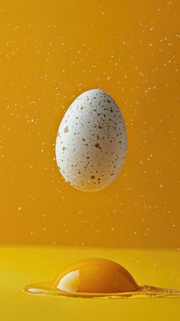 Speckled Egg Floating in Mid-Air Above Broken Egg Yolk on Vibrant Yellow Background