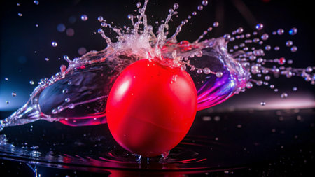 An orange sphere interacts with water, resulting in dynamic splash formations. The image displays a macro-style composition, featuring bright colors like orange and blue against a dark background. The scene suggests movement and impact. Suitable for commercial purposes, including advertising and artistic illustrations.