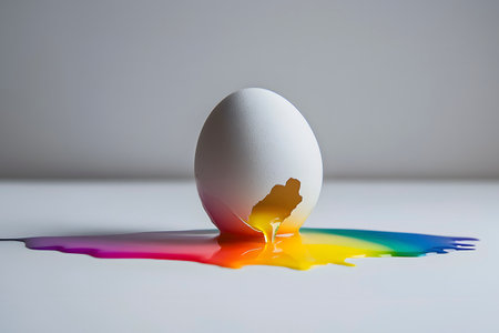 some egg yolk with the colors of the rainbow emerging from a cracked egg and scattering over a white surface