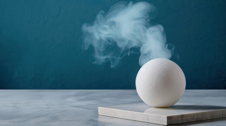 A visually striking white sphere emits delicate smoke, set against a textured blue wall on a marble surface, embodying tranquility and modern aesthetics in design.