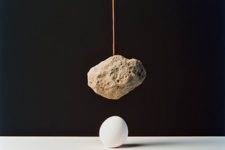 Balanced tension between a hanging rock and a white egg symbolizing fragility and stability, highlighting the concept of balance and contrast in design