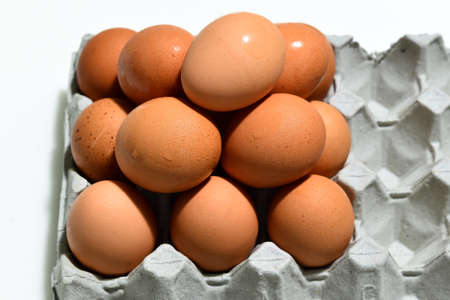 Raw chicken eggs in a cardboard tray, farm brown eggs background.