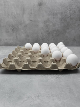 Chicken eggs in a cardboard box on a light background. Close up the white eggs in the gray egg carton.