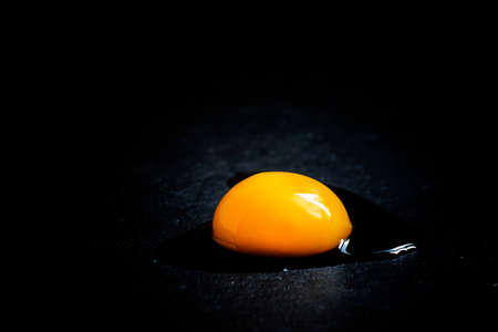Egg yolk poured out from broken eggshell on black surface.