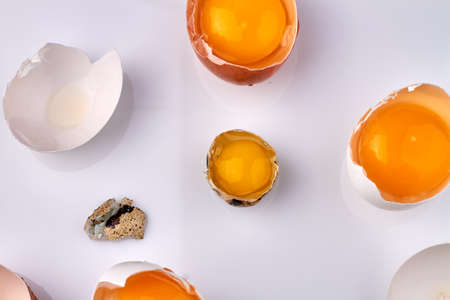 Baking, pastry making or tasty breakfast concept. Two cracked eggshells with strong light and shadows on white cutting board. High quality photo