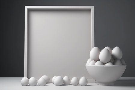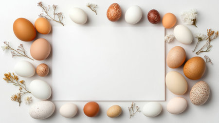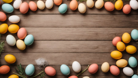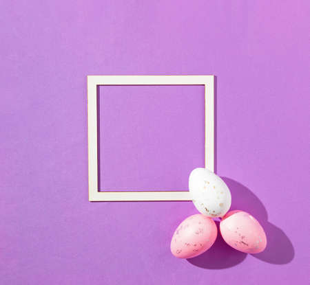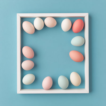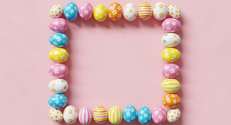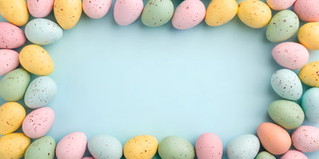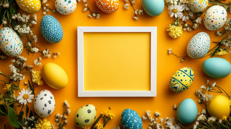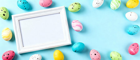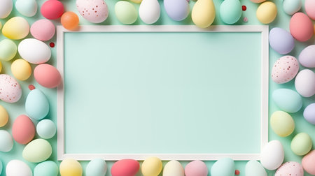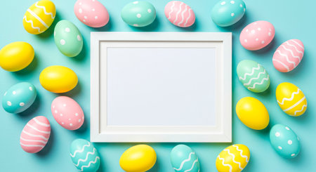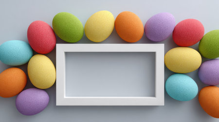 A vibrant collection of colorful Easter eggs in pastel shades surrounds a blank white frame. The setup creates an inviting atmosphere for spring celebrations and seasonal crafts.