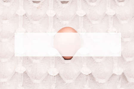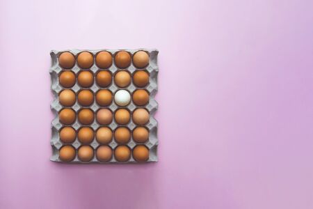 White Egg close up view in the eggs tray with a rows of brown color eggs. Personal individuality or leadership concept image.