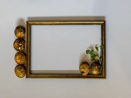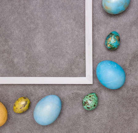 Colored Easter eggs near part of a wooden white frame on a gray background. Happy Easter!