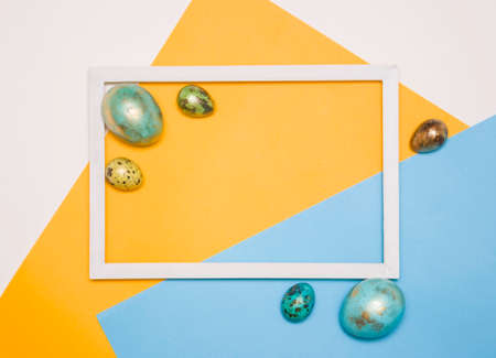 Painted Easter large and small eggs on a blue and yellow background, white wooden frame next to it. Free space for text. Happy Easter!