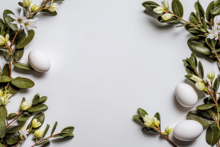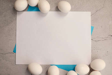 Easter Background with white blank paper card and white Easter Eggs. Top view. Space for text. Environmental concept eco friendly decor, zero waste. High quality photo