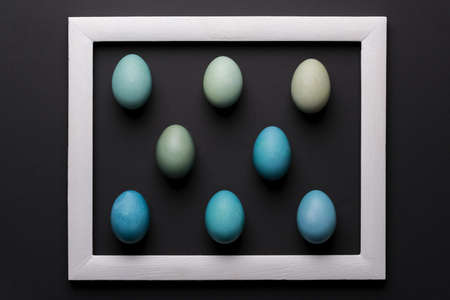 Happy Easter black and white background. DIY dyed shades of blue Easter eggs abstract minimal concept.