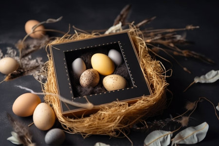 Gold and black wood frame with a beautiful easter eggs. Generative AI