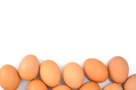 Frame made of fresh raw eggs on white background