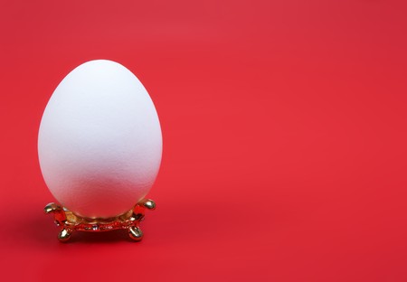 White egg standing on a golden stand against a red background