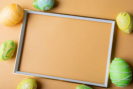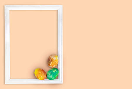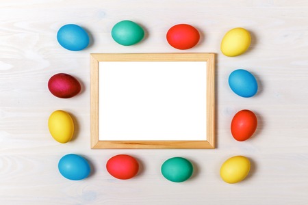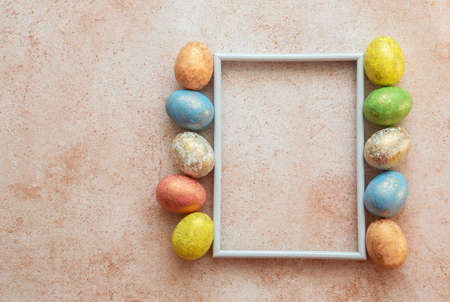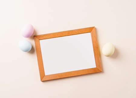 Wooden frame with colorful easter eggs flat lay on beige background