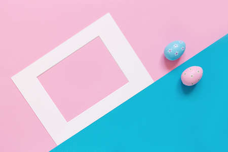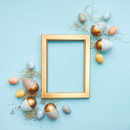 Flat lay composition of pastel Easter eggs forming a frame on a blue background. Holiday mockup with copy space