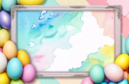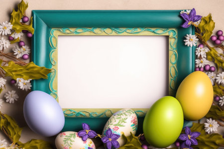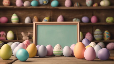 An eye catching illustration of Happy Easter background with message, frame and easter eggs scene. Created using Generative AI tools.