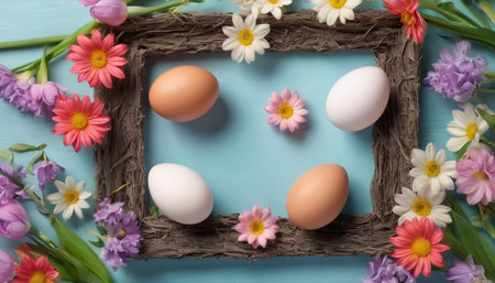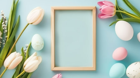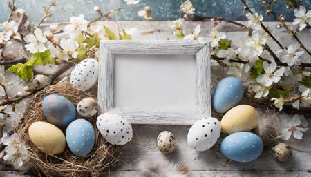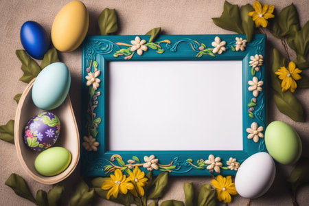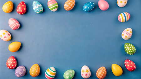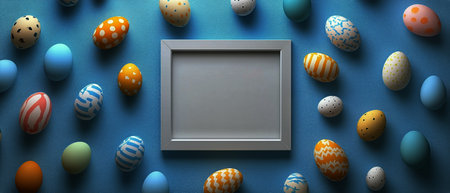 Various decorated Easter eggs in vibrant colors surround a blank frame placed on a blue surface, perfect for adding a personalized touch for the holiday celebration.