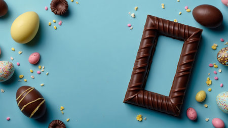 AI Generated. Easter frame from sweet chocolate treats for Easter on light blue background
