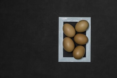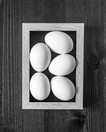 The concept of a simple healthy natural food. Chicken, white, fresh eggs in a frame on a wooden background. Black and white food photo, top view. composition of preparation for Easter