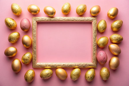 Pink background with white eggs, pearls and gold frames. Elegant Easter design.
