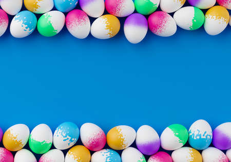 Bunch of colorful eggs on a blue Easter background 3D Rendering. Pile of birght and colorful Easter Eggs - 3d render. easter concept composition frame border
