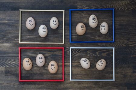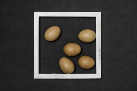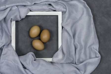 Eggs and white wooden frames composition on the fabric