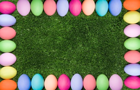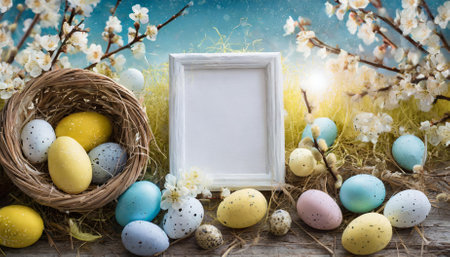 Celebrate Easter with a charming background showcasing a decorative message frame surrounded by colorful Easter eggs in a cheerful spring setting. Ideal for greeting cards, digital designs, and