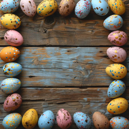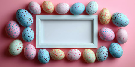 Surrounded multicolor speckled eggs Easter ai generated frame mock up. Festive occasion Eastertide photoframe mockup with blank space. Eastertime concept composition top view, border picture