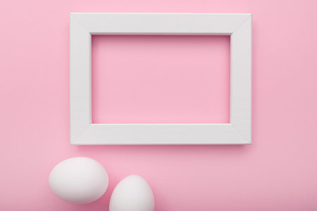 White eggs on pink background. Symbol Happy Easter Flat lay Copy space