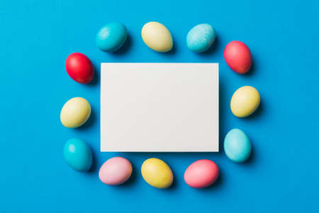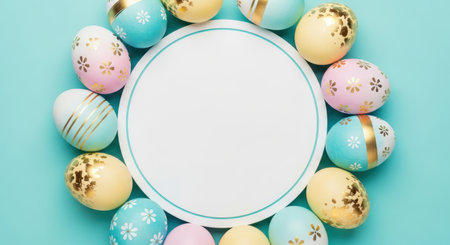 Colorful pastel easter eggs in circular arrangement around white blank paper on blue background for festive spring celebration design.
