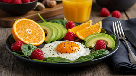A healthy breakfast plate with avocado, orange slices, raspberries, and a fried egg on a bed of spinach.
