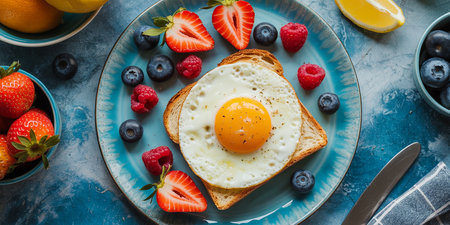 Healthy breakfast with fried egg and fresh berries on blue background, top view