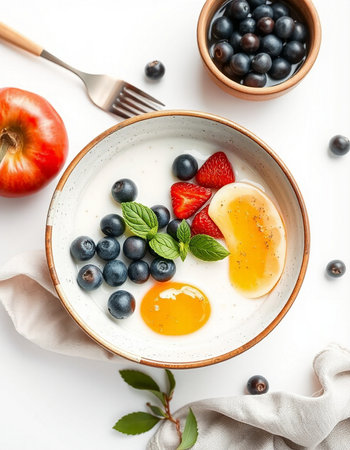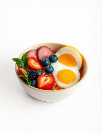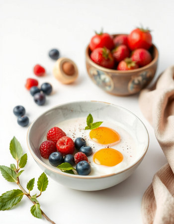 Healthy breakfast bowl with fresh berries and eggs on white background