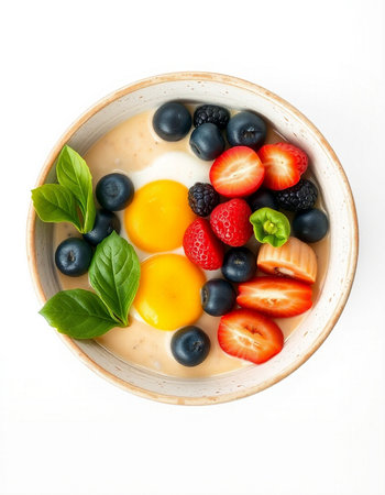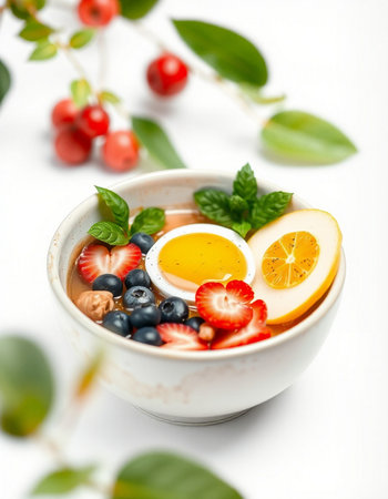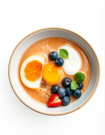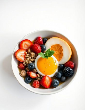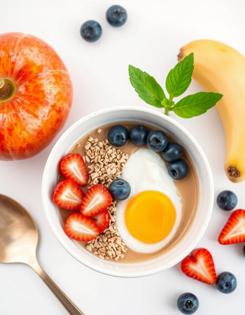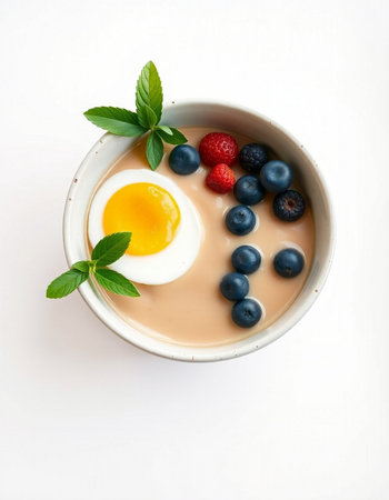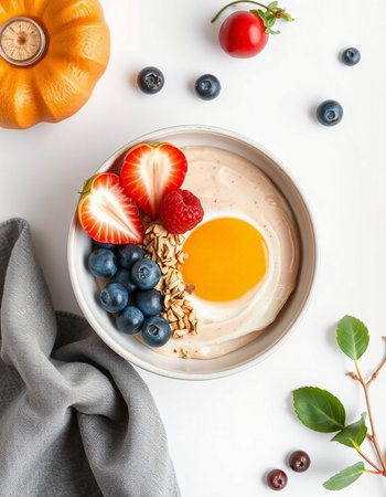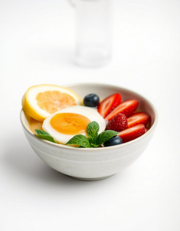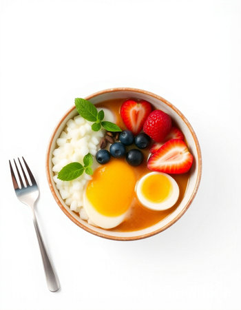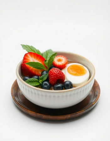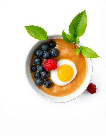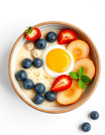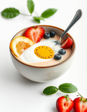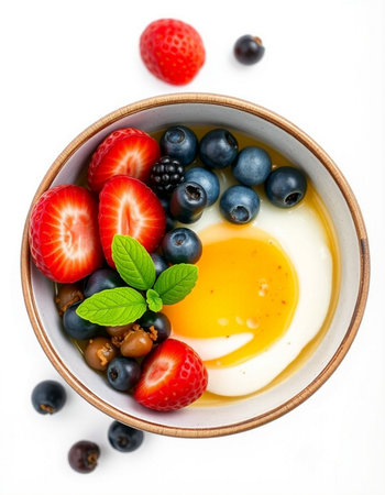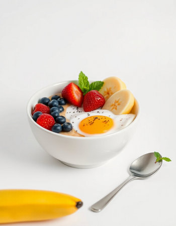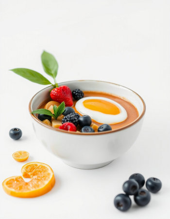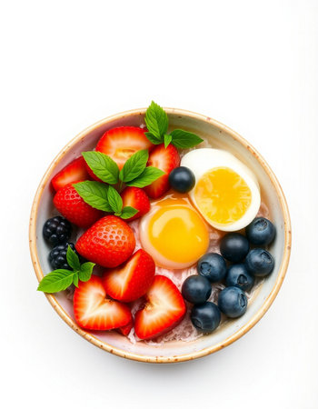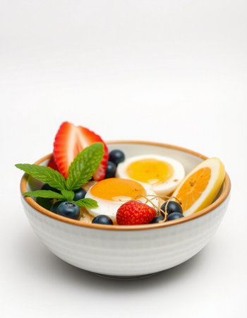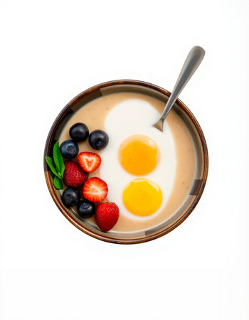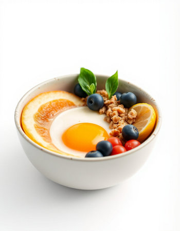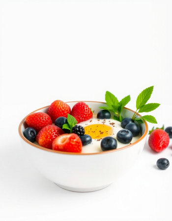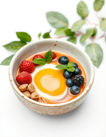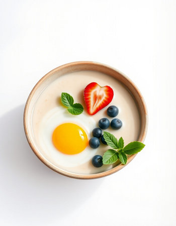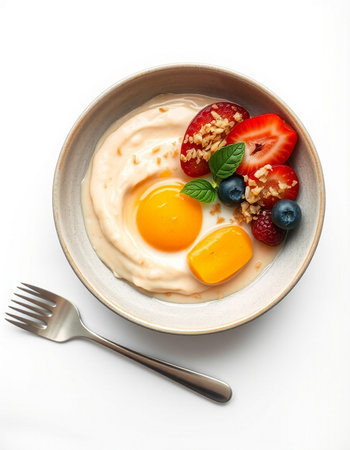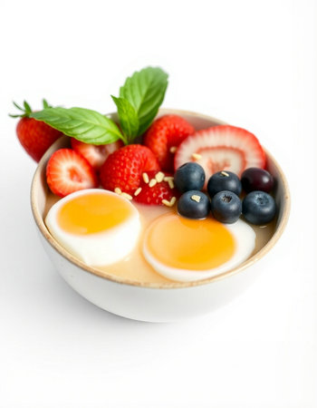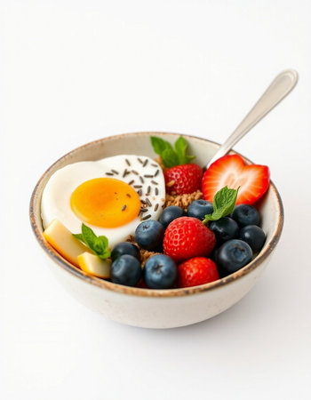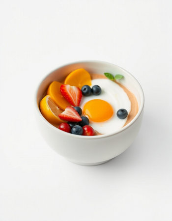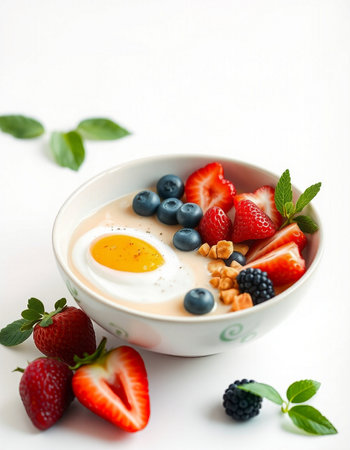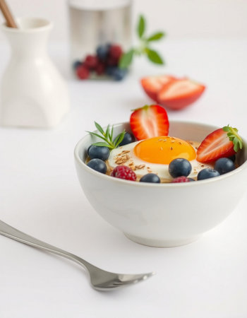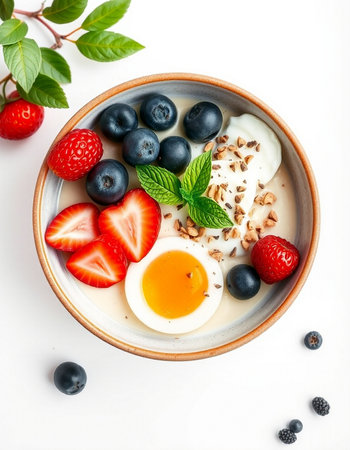 Bowl of yogurt with berries and egg on a white background.