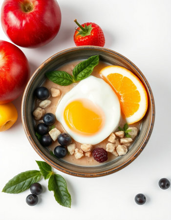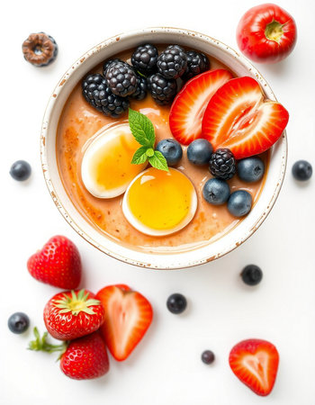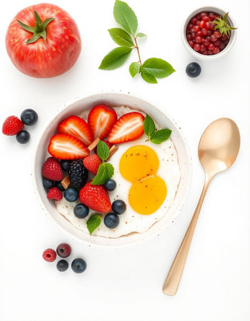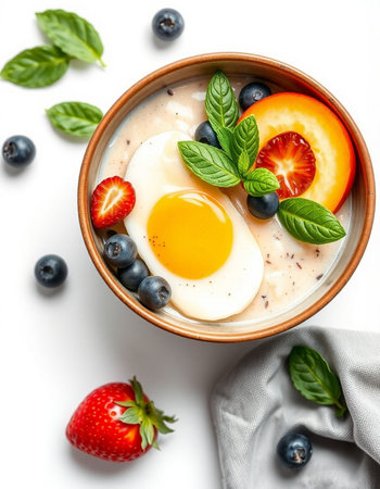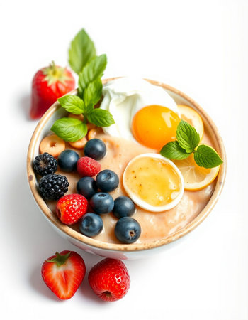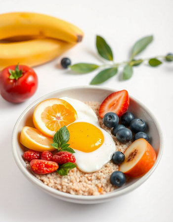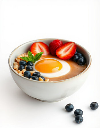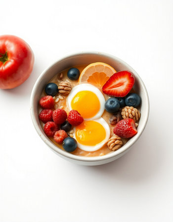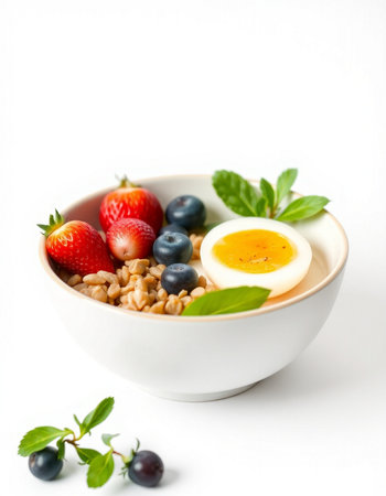 bowl of oatmeal with fresh berries and eggs on a white background