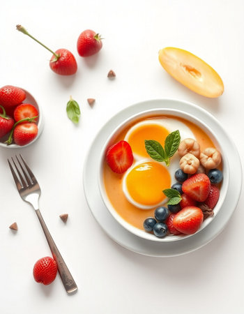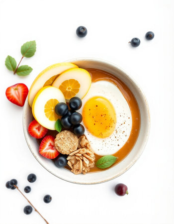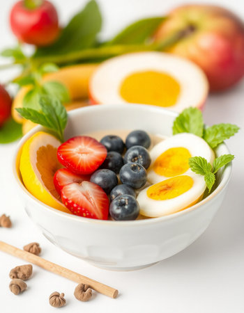 Healthy breakfast bowl with fruits, berries and eggs on white background