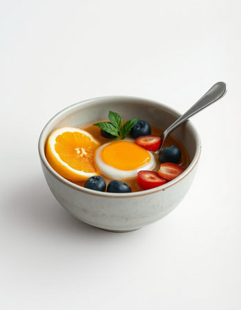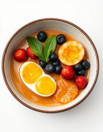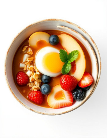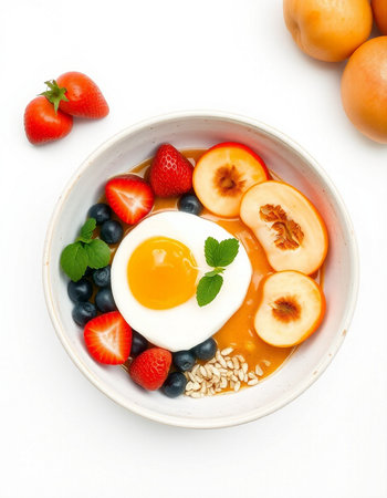 Fried egg with fruits in a bowl on a white background.