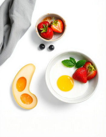 Healthy breakfast with yogurt, berries and egg on a white background