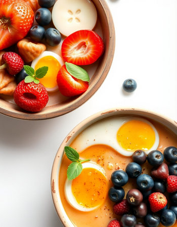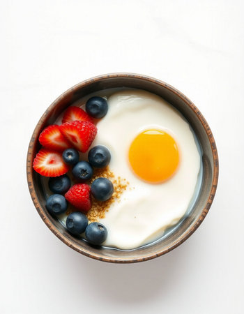 Yogurt with strawberry, blueberry and egg in a bowl