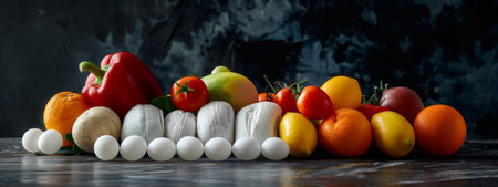 A rustic display of fresh vegetables and fruits, including tomatoes, oranges, and mushrooms, arranged on a dark, textured background. The image emphasizes natural ingredients and organic living.