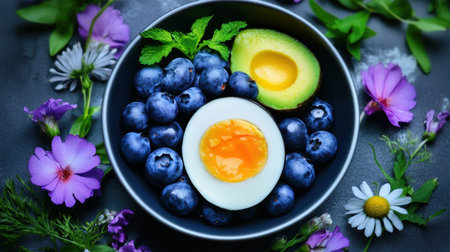 A bowl contains blueberries, an avocado, and an egg arranged on a wooden table,.